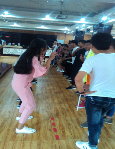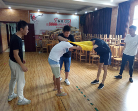 到达训练场地后,未经休息,马上进行破冰环节。在专业教练的指导下,参与培训的全体人员不分职务、不分年龄、不分性别随机组建成4个团队,每支队伍快速制订各自队名、队歌、口号,形成了团队文化。训练中先后开展了“猎人与老虎”、“报告魔王”、“急速旋转”、“衣服接力”等训练项目。