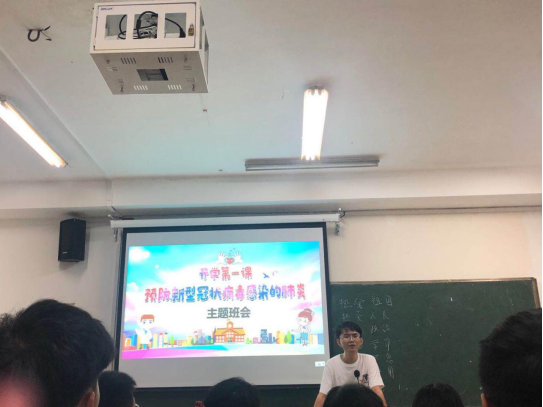 主题班会现场,辅导员讲解新冠病毒的相关知识:感染的症状、传播途径、如何预防等。