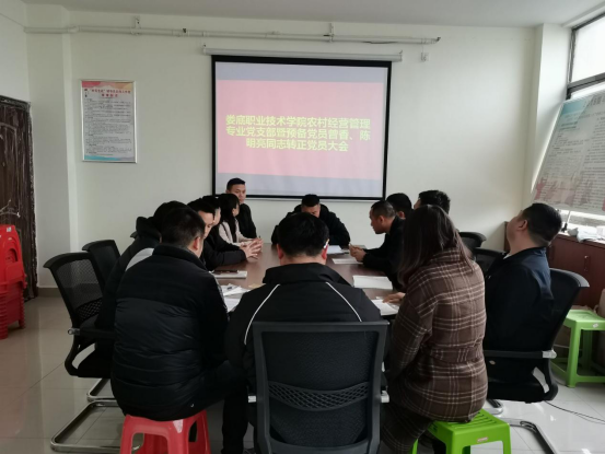 2021年3月5日上午十点半,娄底职业技术学院2019级农村经营管理专业党支部暨预备党员曾香、陈明亮同志转正党员大会在综合楼907办公室里召开。整场会议由党支部书记以及入党介绍人谭京瑚主持,经支部委员、纪律委员胡海良清点完到会党员数后,会议正式开始。