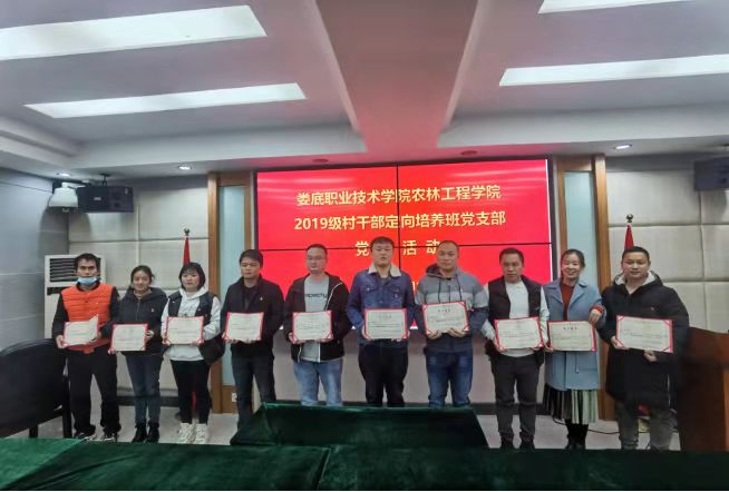 而后农林工程学院总支书记王冬青宣读了2020年下半年至2021年上半年19级村干部定向培养班党支部委员会的“优秀共产党员”名单,同时也希望受表彰的优秀共产党员,戒骄戒躁,锐意进取,发扬成绩,团结和带领全体党员为全面完成接下来的各项工作再立新功,随后由出席活动的领导为获奖人员颁发了荣耀证书。