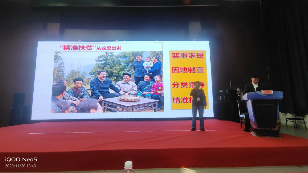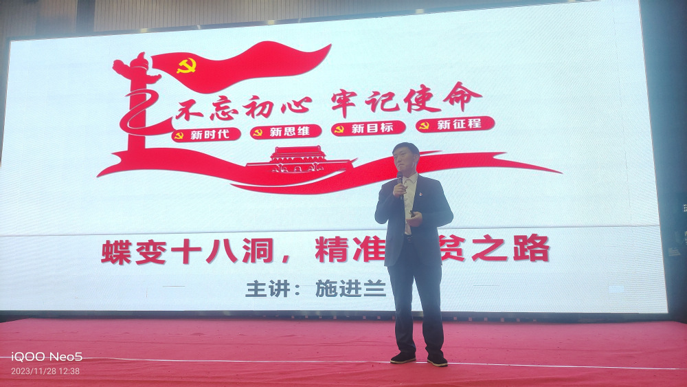 讲座由刘梅秋主持,十八洞村原村主任施进兰为我们解读了十八洞村近10年的发展历程。施主任围绕十八洞村的昨天、今天和明天介绍:从十年前的苦和酸,再到今天十八洞村通过党建引领因地制宜发展猕猴桃产业1000亩、油茶产业300亩、开办十八洞山泉水产业,以及“让妈妈回家”苗绣项目带动54名留守妇女就业的产业致富路十分不易。同时讲述了以旅游业发展的独天优势,并与矮寨、德夯大峡谷景区一起获评国家5A级旅游景区,使全村人均纯收入从2013年的1668元跃升到2022年的23505元实现全部奔小康的伟大目标。