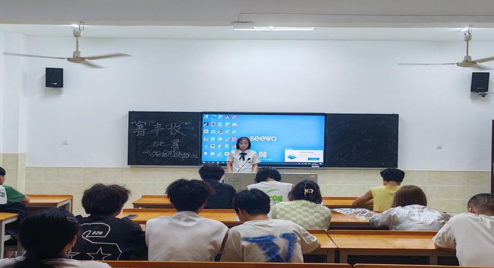 本次考试是通过“学习通”手机应用进行答题。首先是由尹涵轩同学在讲台上发表讲话并且宣布本次“赛丰收”比赛正式开始。接着同学们都拿出手机准备开始考试。班会现场气氛热烈,同学们个个精神饱满、斗志昂扬。在比赛过程中,同学们全神贯注地盯着手机屏幕,认真答题。时间的快速流逝也增添了比赛的紧张感,让同学们在有限的时间内充分发挥出自己的实力。老师在一旁也密切关注着考试情况,保证比赛的顺利结束。