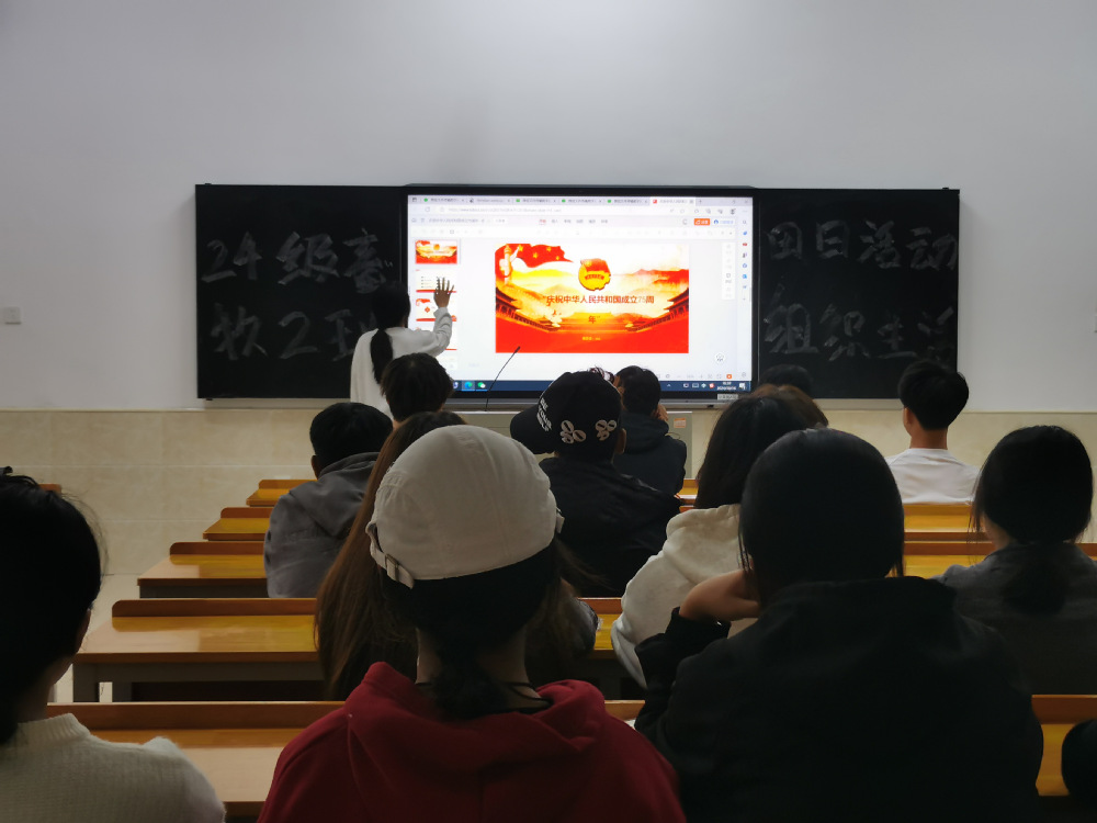 为庆祝新中国成立75周年,回顾新中国的光辉历程,同时激发同学们的爱国热情和民族责任感、自豪感。 2024年10月16日,24级畜牧二班在主教楼117举行以“庆祝中华人民共和国成立七十五周年”为主题的组织活动,该会议由团支书全思瑶同学主持。