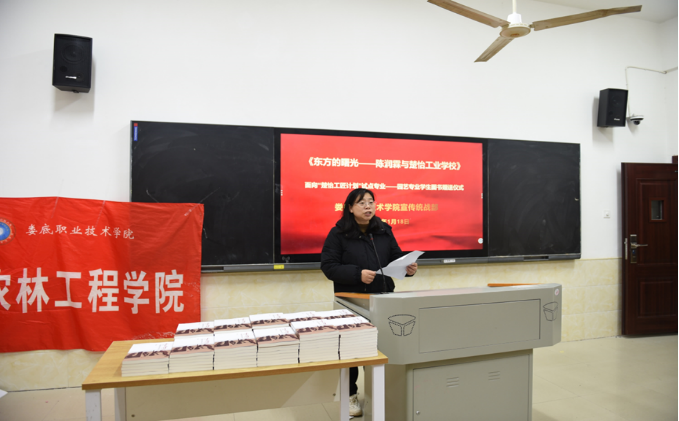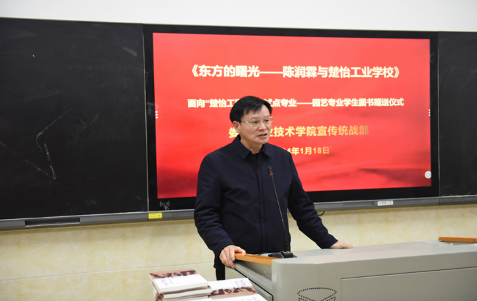 为传承楚怡工匠精神,培养学生爱读书读好书的良好习惯,1月18日上午,在“楚怡· 园艺”——学习竞赛活动周启动仪式上,学校党委宣传统战部在主教学楼505室为我校“楚怡工匠计划“试点专业——园艺专业学生赠送了《东方的曙光——陈润霖与楚怡工业学校》图书。宣传统战部副部长刘艳,农林工程学院院长禹华芳,副院长王琦、谢大识,辅导员肖姣娣、周永胜、周凌博老师参加了本次活动。