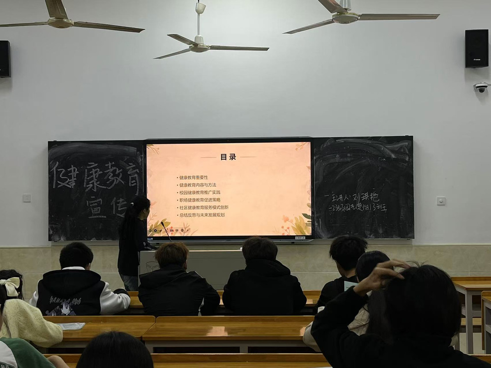 刘琪艳同学首先讲了健康教育的重要性,这让同学们深刻的认识到了健康教育对群众以及社会带来的好处。随后,刘琪艳同学说明了健康教育宣传的内容并举例了进行健康教育宣传的方法,刘琪艳同学具体从校园,职场,社区这三个场所说明了如何进行健康教育宣传活动。通过刘琪艳同学的说明后,同学们进一步理解了健康教育宣传的重要性并知道了如何开展健康教育宣传。