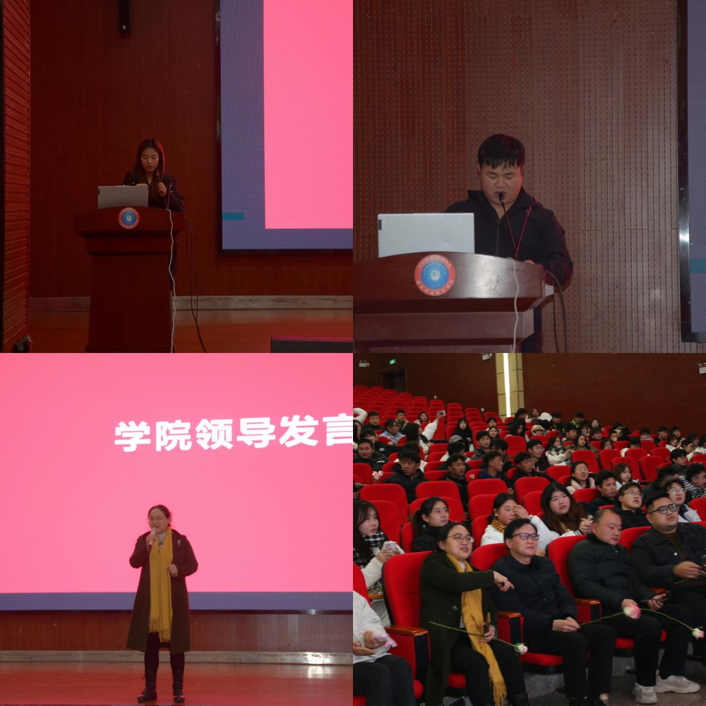 图1 为23级农管1班王晶作为23级干部代表发言、图2 十七届学生会主席彭威代表发言、图3王书记致辞、图4学院领导出席活动现场