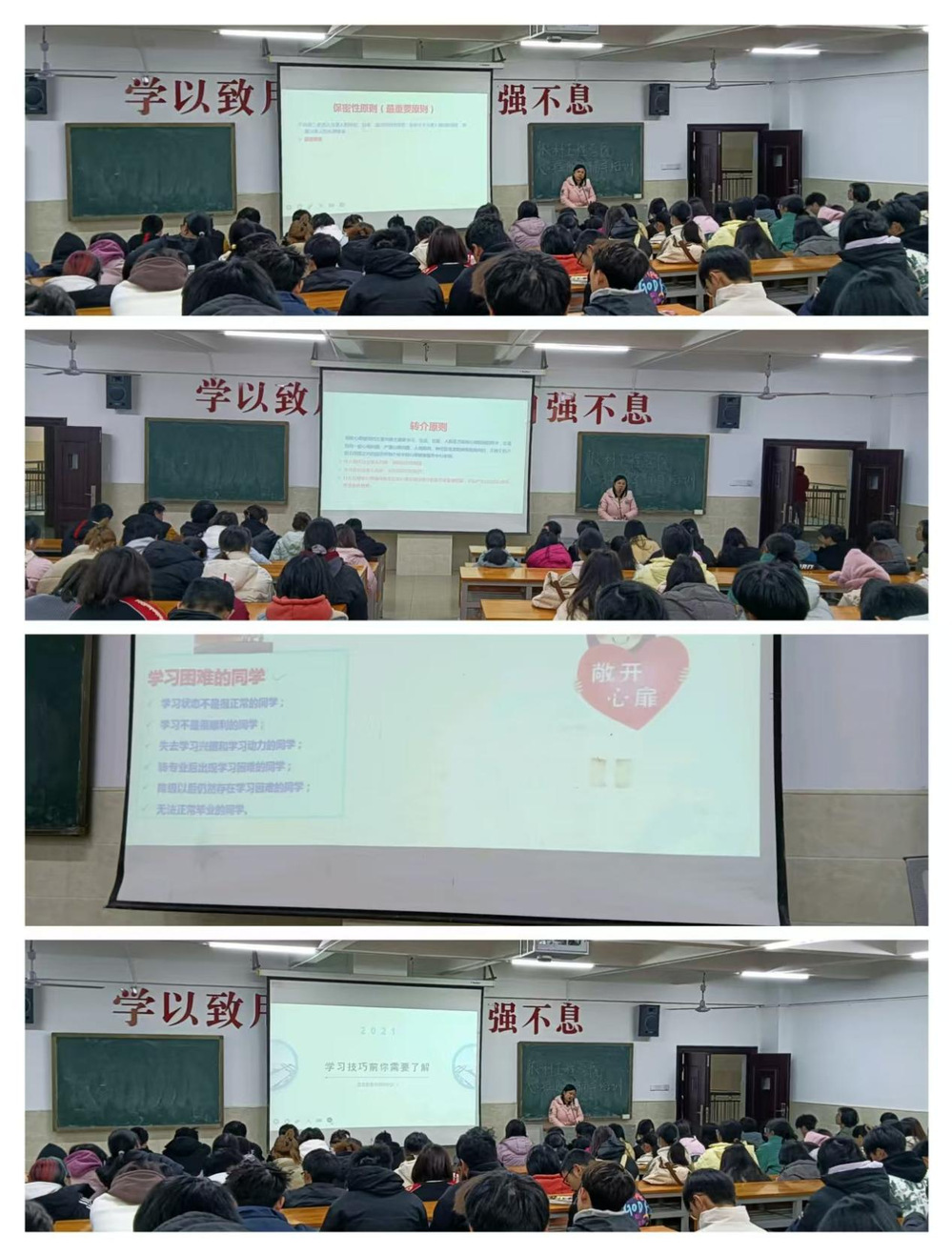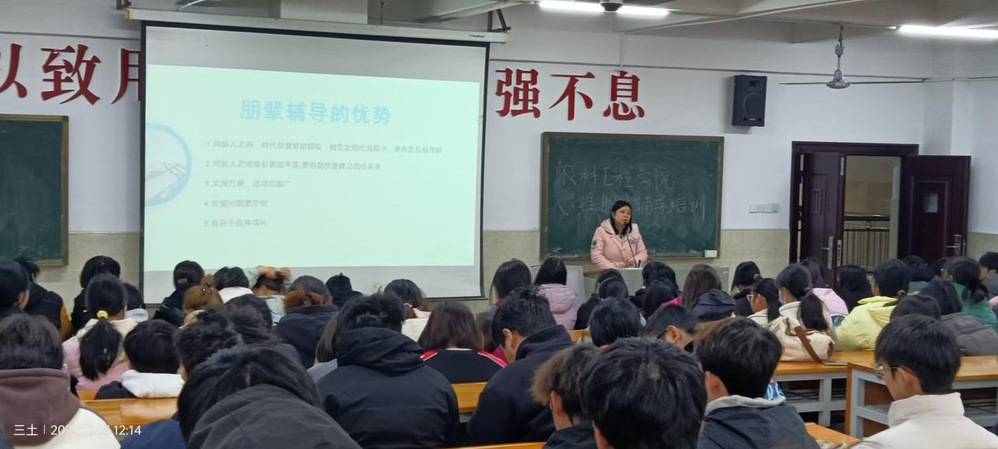 为了进一步提升大学生心理健康水平,加强心理朋辈辅导队伍建设,农林工程学院心教部于12月23日中午12点,在学校主教楼210开展了“大学生心理朋辈辅导培训”。本次培训参加人员有心教部全体成员、农林工程学院23级,24级心理委员及信息员等人。