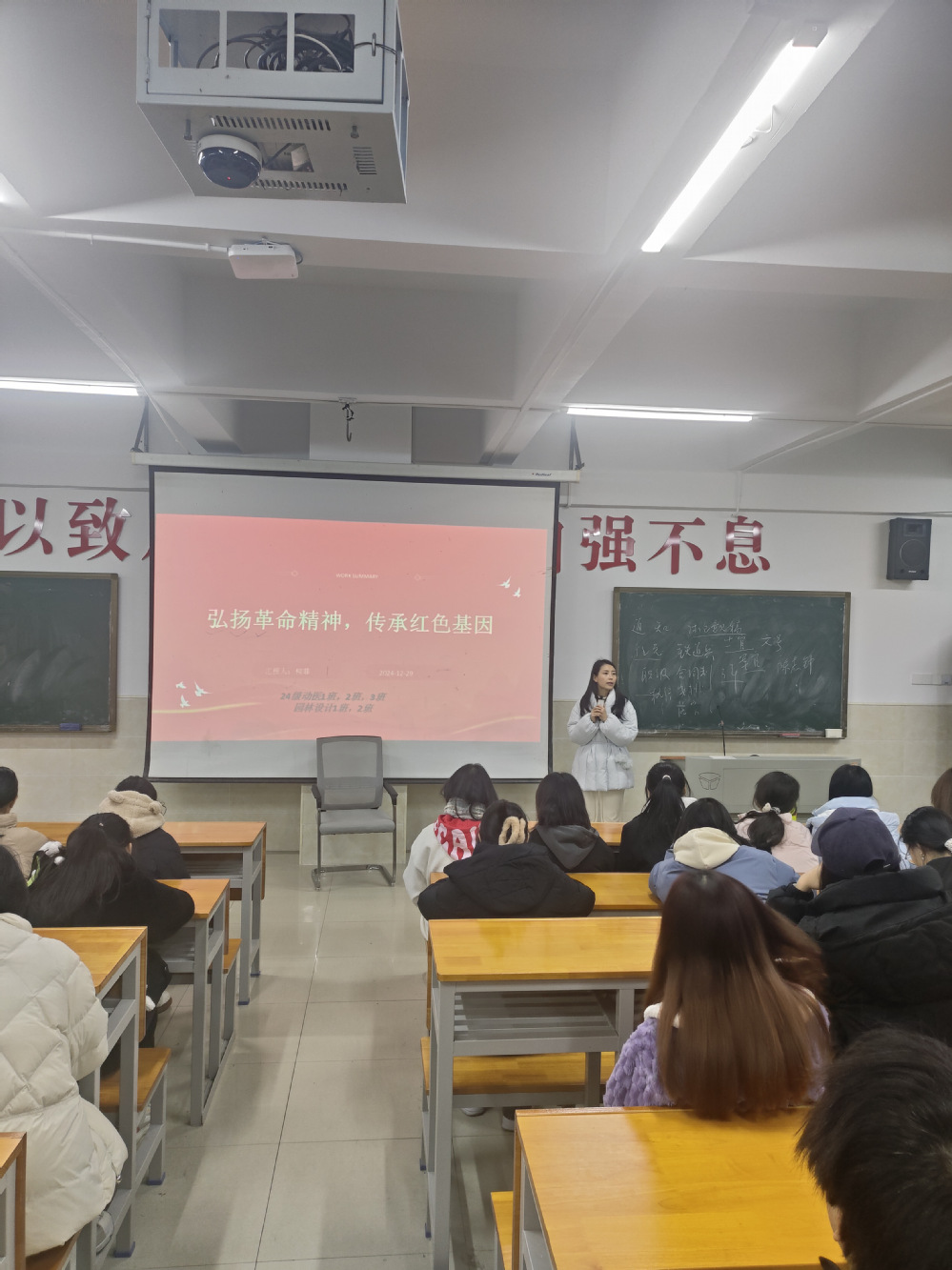 为响应国家号召,推进红色文化进校园、进课堂,辅导员柳菲老师所带的24级动医1班,2班,3班,园林(设计)1班,2班在210教室特举办了一场以“弘扬革命精神,传承红色基因”为主题的班会。