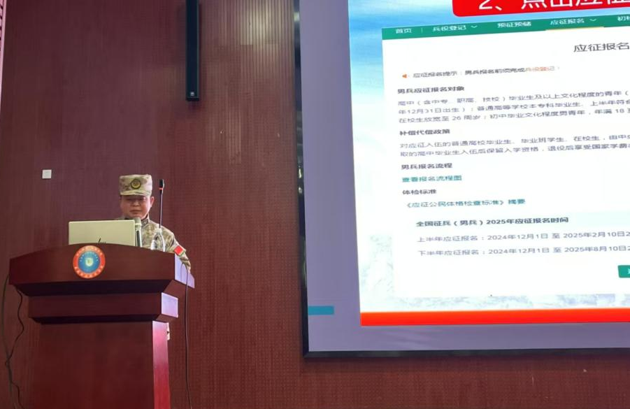 为激发同学们的爱国热情,引导同学们将个人理想融入国家发展,积极投身国防事业,贡献青春力量。12月12日,农林工程学院联合保卫处张亮在新培楼学术报告厅举办了大学生征兵宣传讲座。农林工程学院副院长王琦带领农林工程学院22、23、24级全体男生参加此次讲座,由保卫处张亮老师主讲。