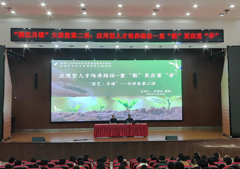 2024年10月23日下午,湖南人文科技学院农业与生物技术学院院长、娄底市农业科学研究所所长及协同创新中心主任、湖南省油菜产业协会副会长、湖南省植物学会常务理事向国红教授,亲临娄底职业技术学院新培楼报告大厅,以“应用型人才培养路径——重教更应重学”为题进行讲座。农林工程学院副院长谢大识、园艺园林及农村新型经济组织管理教研室全体教师,以及园艺“楚怡”班和园林、园艺专业学生共计700余人参加。讲座由农林工程学院党总支书记王冬青主持。