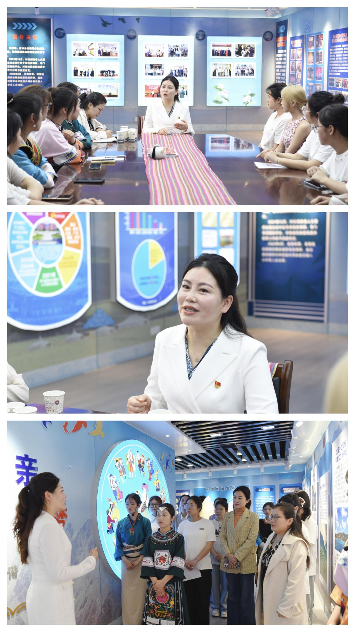 在授课前,彭艳副馆长应邀来到学校民族团结进步基地为基地讲解员辅导。彭艳副馆长曾任韶山毛泽东同志纪念馆宣教部长,有着丰富的讲解理论和实践经验,彭艳副馆长从讲解仪态、手势、表情、语音、语调、讲解内容等方面的进行了示范辅导,提升了基地讲解员们的综合素质和业务能力,提振了讲解员的工作热情和积极性。(文/邓跃军 乃芳 图/黄云霄)