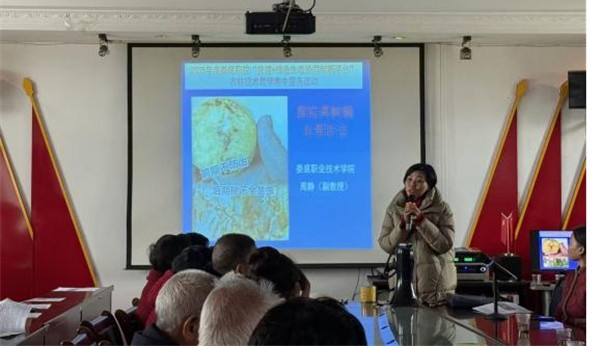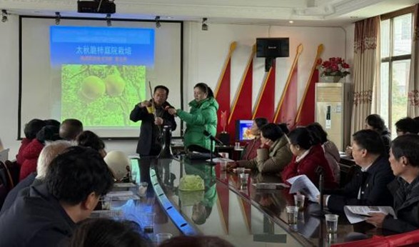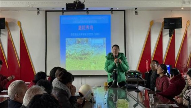 上午9时活动正式开始,由王冬青书记做开场讲话。随后,中阳村党支部书记曹连良代表村支两委对院村合作给村里带来的良好成效表示感谢。培训现场,服务队员向参会村民发放技术资料,周静副教授围绕庭院果树病虫害防治展开讲解,结合“前期不防治,后期桃子全是虫”的实际案例,生动剖析病虫害发生规律与科学防治技巧;曾玉华教授聚焦太秋脆柿庭院栽培技术,从品种特性、种植管理到丰产养护,进行细致的实操指导;刘莎莎老师分享庭院养鸡的养殖要点,针对养殖环境搭建、饲料配比、疫病防控等村民关心的问题逐一解答;周永胜副教授讲解了庭院植物枝条粉碎还田技术,阐述资源化利用对改善土壤肥力、推动生态种植的重要意义。