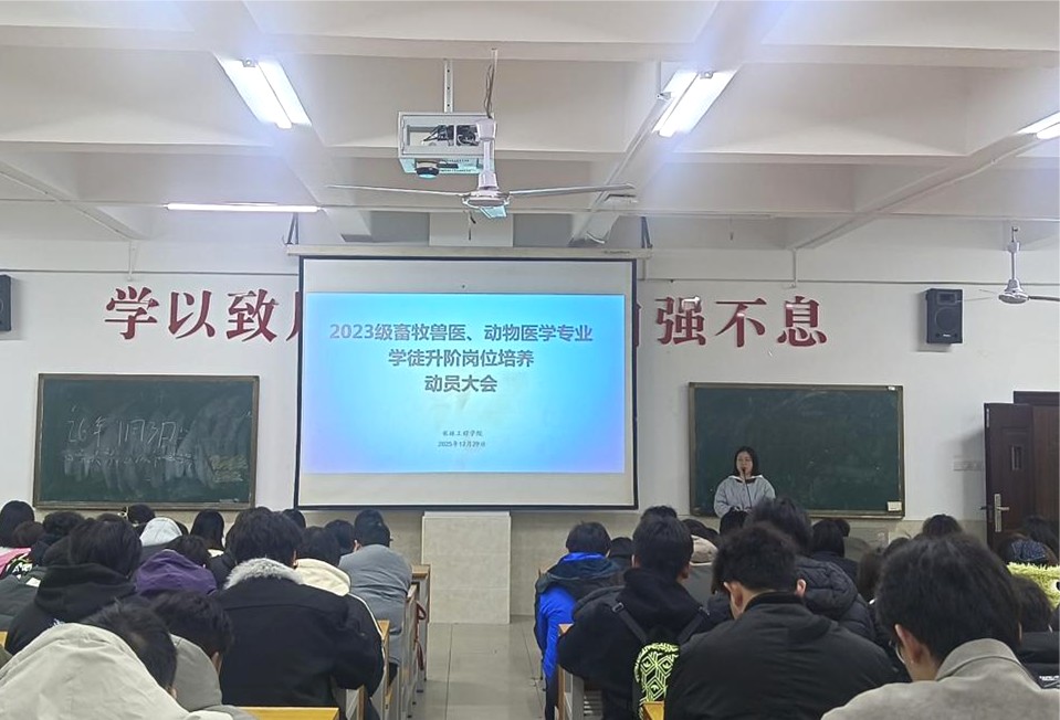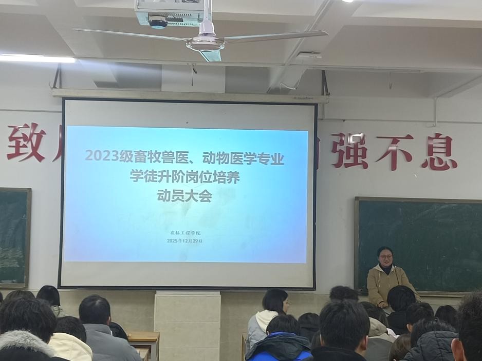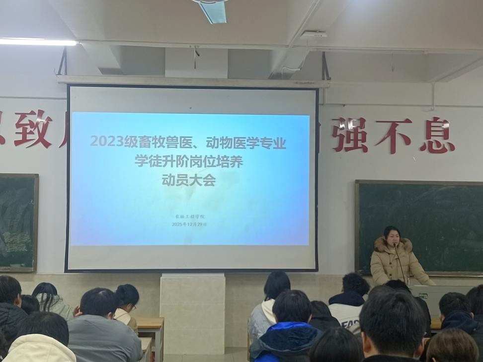 12月29日晚上,农林工程学院在主教学楼110教室组织召开2023级畜牧兽医、动物医学专业学徒升阶岗位培养动员大会。学院党总支书记王冬青、动物医学专业教研室主任王先坤、全体岗位培养指导教师及2023级畜牧兽医、动物医学专业全体学生参会,会议由王先坤主持。