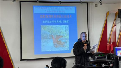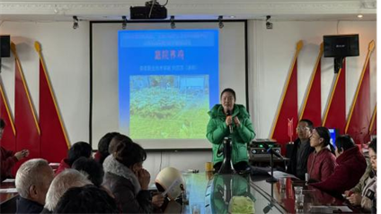 上午9时活动正式开始,由王冬青书记做开场讲话。随后,中阳村党支部书记曹连良代表村支两委对院村合作给村里带来的良好成效表示感谢。培训现场,服务队员向参会村民发放技术资料,周静副教授围绕庭院果树病虫害防治展开讲解,结合“前期不防治,后期桃子全是虫”的实际案例,生动剖析病虫害发生规律与科学防治技巧;曾玉华教授聚焦太秋脆柿庭院栽培技术,从品种特性、种植管理到丰产养护,进行细致的实操指导;刘莎莎老师分享庭院养鸡的养殖要点,针对养殖环境搭建、饲料配比、疫病防控等村民关心的问题逐一解答;周永胜副教授讲解了庭院植物枝条粉碎还田技术,阐述资源化利用对改善土壤肥力、推动生态种植的重要意义。