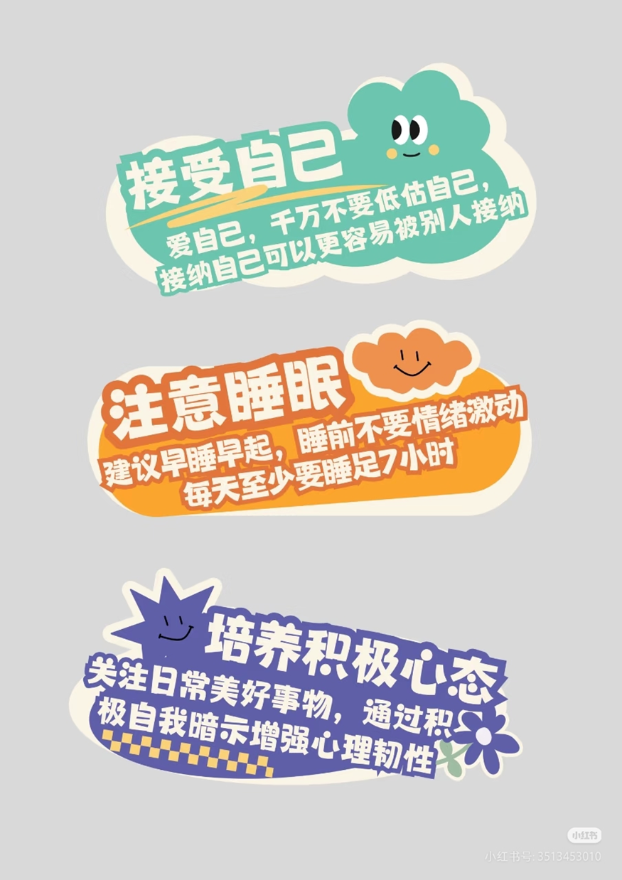 - 规律生活,稳定节奏:建议学生逐步恢复早睡早起的作息,按时就餐、适度运动,用稳定的生活节奏安抚身心,缓解焦虑感。
