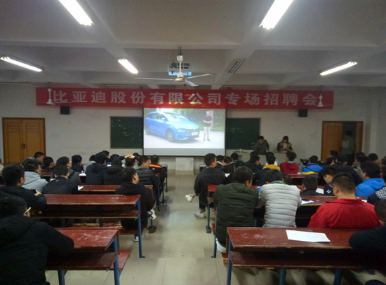 为缓解大学生就业压力,汽车学院于11月22日晚上7点30分在主教楼410开展比亚迪股份有限公司专场招聘会,本次招聘会由比亚迪股份有限公司人事部经理王传福主持,汽车学院15级应届毕业生参加。