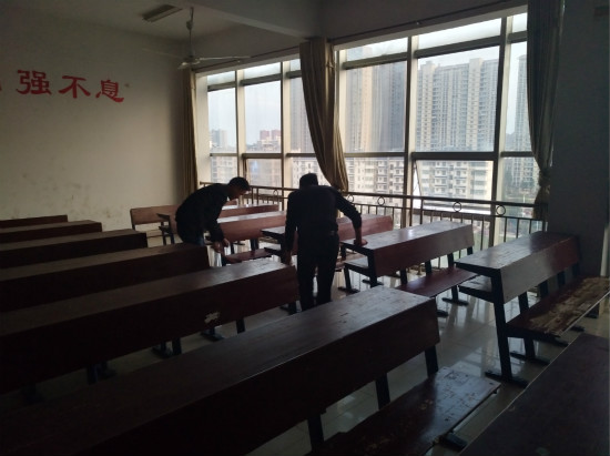 三十多号人分成两组,组长由两位副班长担任,各自带领一组同学清扫一层楼。在组长的带领下,有的同学扫地;有的抹黑板;有的拖地;场面十分热闹。不一会儿就把卫生打扫完了。最后,同学们在欢笑中离开了主教楼。