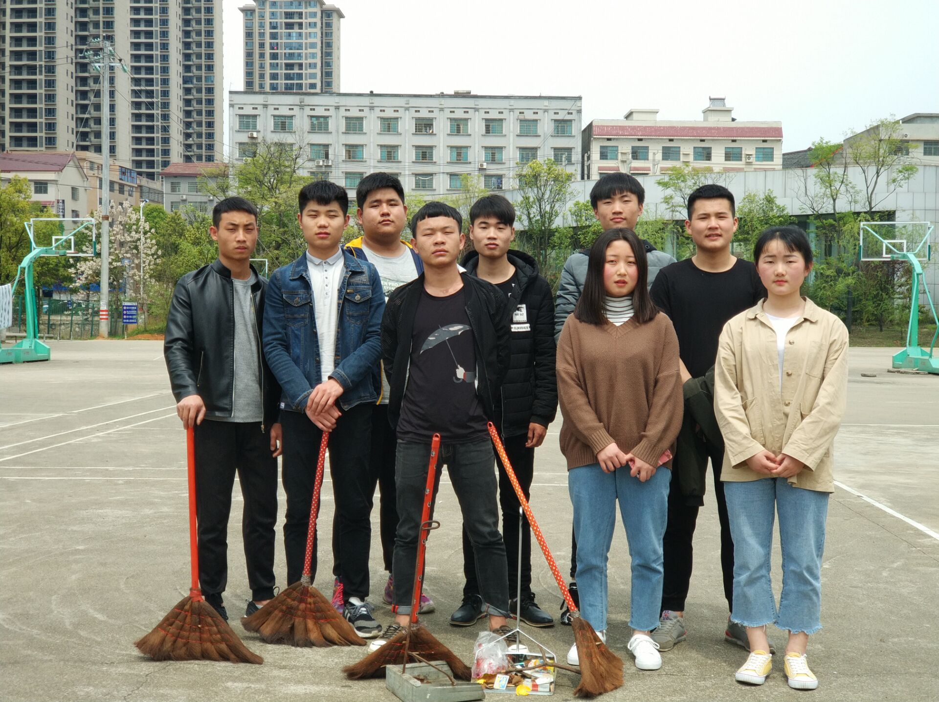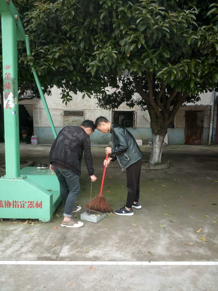 当天中午12点10全体成员在篮球场集合,由部长分配任务划区域打扫篮球场卫生,以保持校园的整洁给同学们营造一个良好的运动坏境。大家相互合作,合理分工,积极配合,不怕脏不怕累,很快就使篮球场焕然一新,而他们的这种精神也成了校园的一道亮丽的风景,默默地奉献自己的力量,此次活动圆满完成,最后部门全体成员拍照留念。