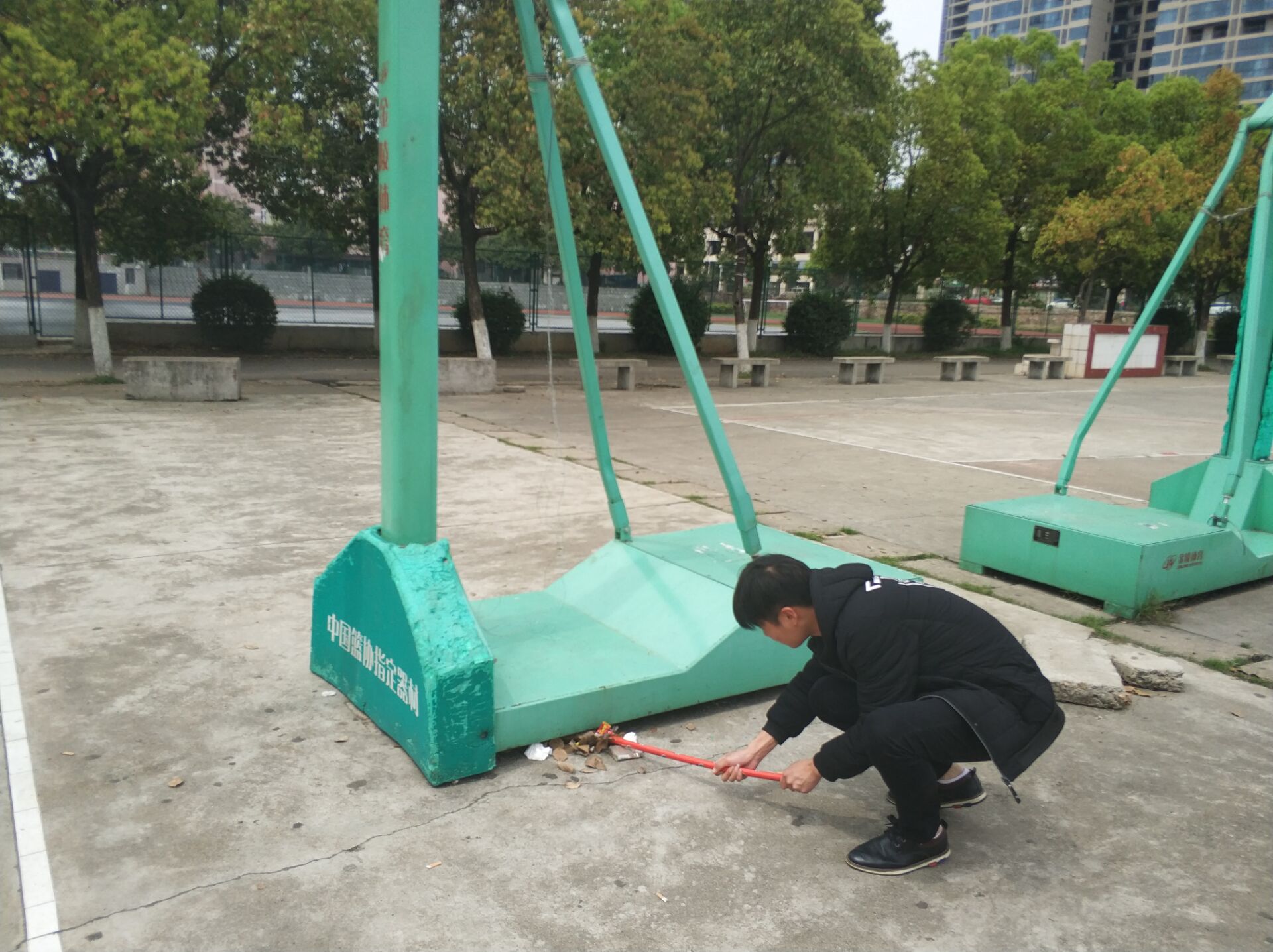 当天中午12点10全体成员在篮球场集合,由部长分配任务划区域打扫篮球场卫生,以保持校园的整洁给同学们营造一个良好的运动坏境。大家相互合作,合理分工,积极配合,不怕脏不怕累,很快就使篮球场焕然一新,而他们的这种精神也成了校园的一道亮丽的风景,默默地奉献自己的力量,此次活动圆满完成,最后部门全体成员拍照留念。