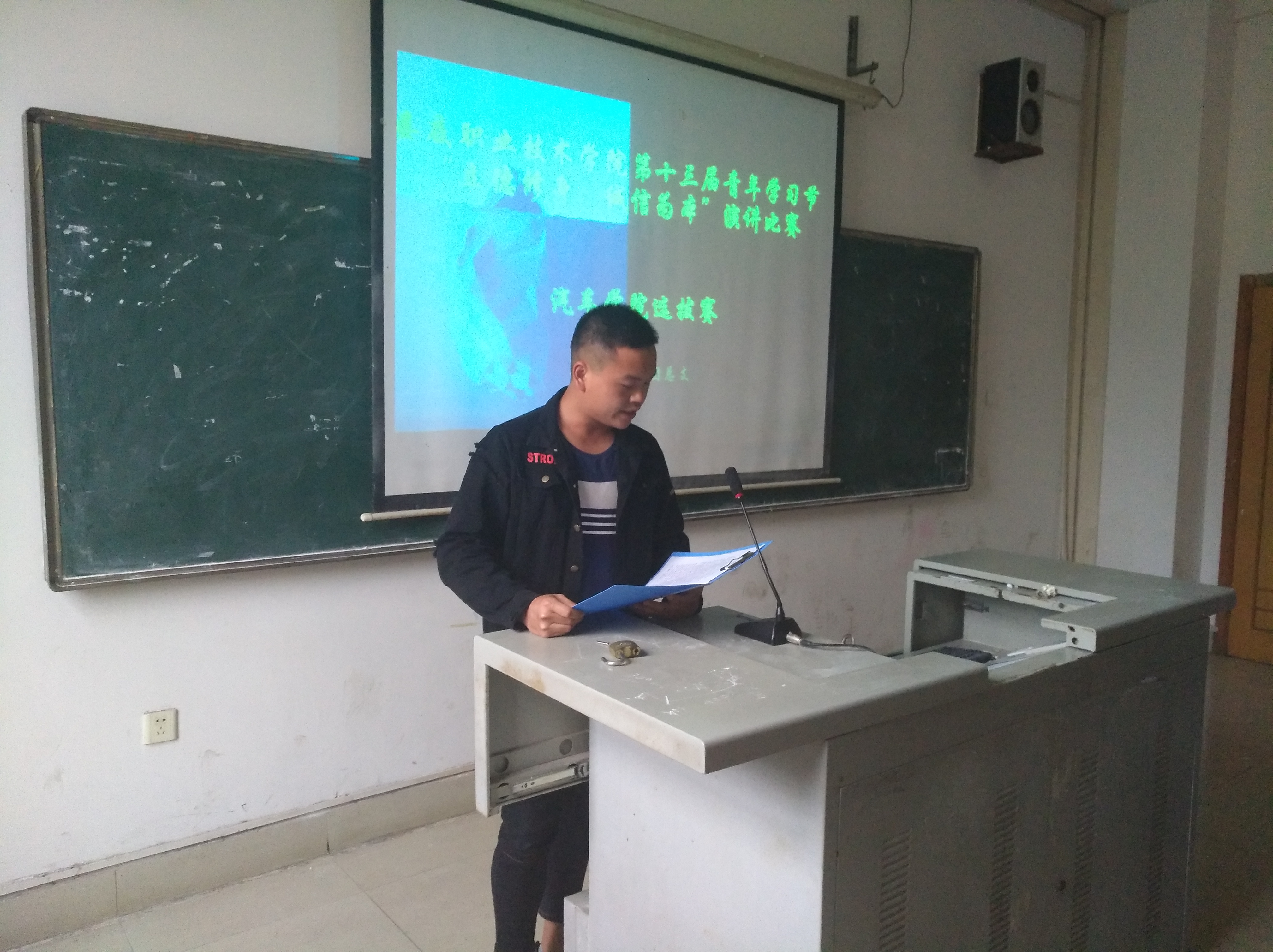 2018年04月12日,由汽车学院主办的第十三届青年学习节“立德修身,诚信为本”演讲比赛顺利进行。参加本次初赛的有来自不同班级的14名选手,担任本次初赛的评委老师有团总支书记潘晨芬,学工干事吴恕,学生代表贺凤凰,陈长虹主持本次比赛,本次比赛吸引了来自2016级和2017级近五十名学生观看了此次演讲比赛,初赛在同学们的热烈掌声中拉开帷幕。