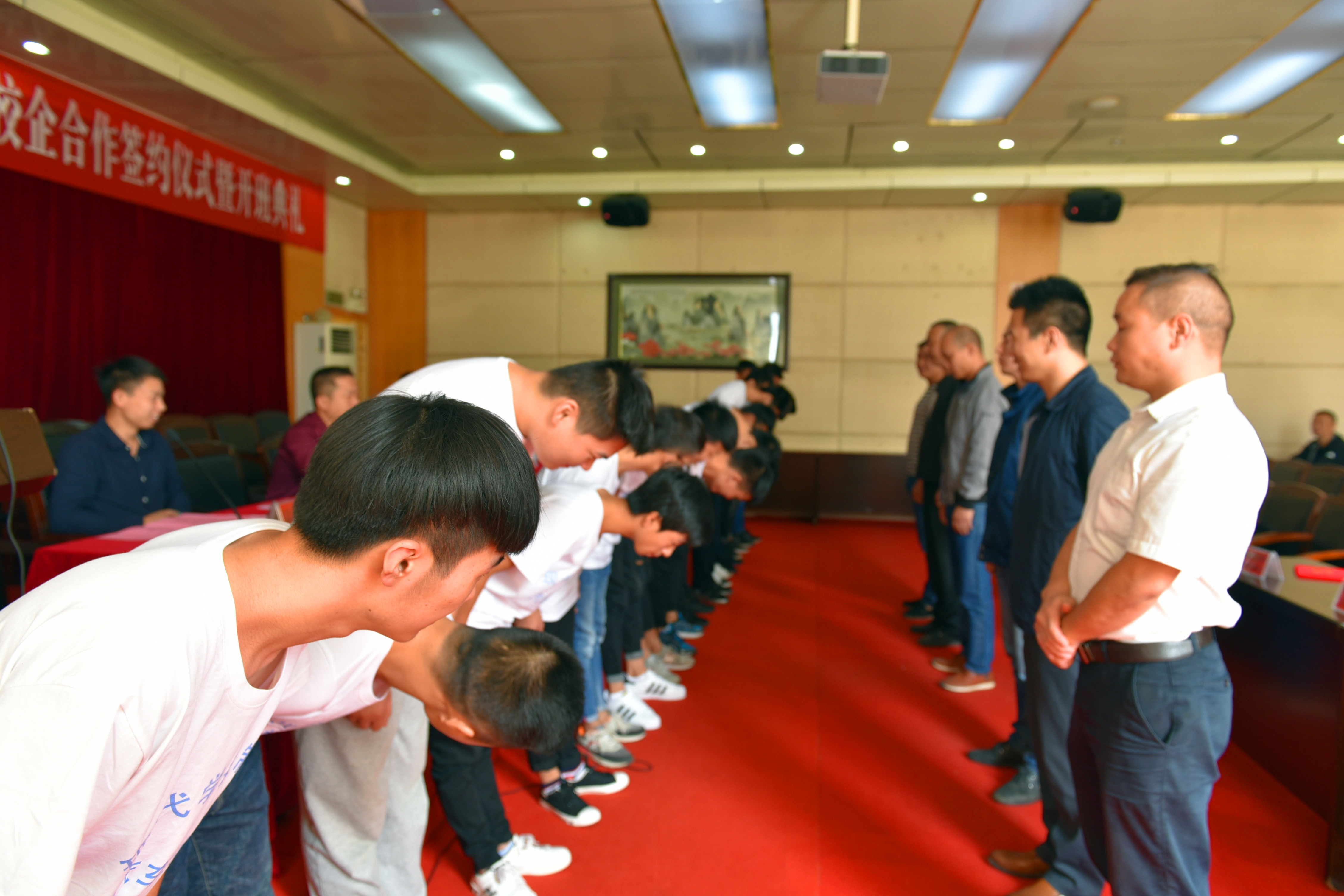 随后,校企双方领导分别和娄底湘诚汽修、三湘汽修等5家企业签订了校企合作协议,举行授牌仪式并对企业师傅发放了聘书。期间,学徒制班的15名学生行拜师礼,大声喊出“我们一定向师傅学习,勤学苦练”,声音洪亮,决心满满。