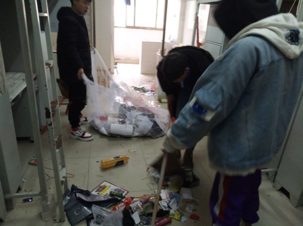 在宿管部负责人的带领下,成员们分工明确:有负责清扫的;有负责收集的;还有负责倒垃圾的。成员们手持卫生工具,在4至6楼的寝室之间来回清扫,将每间宿舍的卫生死角以及公共部分进行非常的细致的清扫。