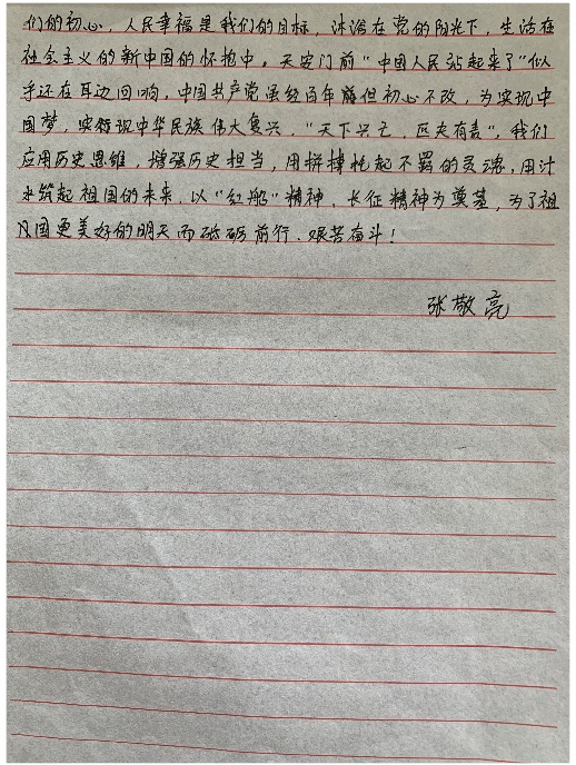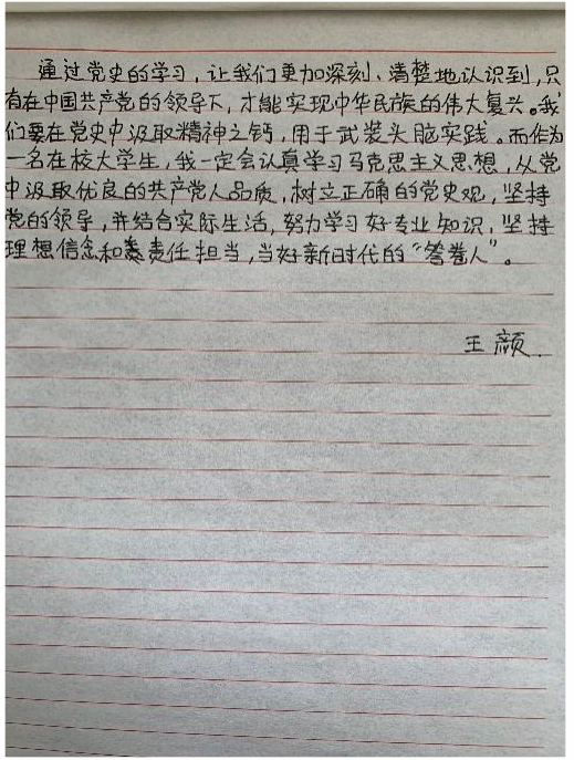 各班在学习党史之后,由班长收集班上同学的学习心得,最后进行评比。“历史是最好的教科书,每重温党的百年历史都会带来新的启迪。在此次学习教育活动,我与同学们都进一步向历史寻经验、求规律、探未来。”,追寻红色记忆,我们深感自豪、备受鼓舞,展望新的历史使命,我们信心百倍、斗志昂扬。,“党史是成为党员的必修课,我们要学深学透学好,从党的百年历史中汲取智慧和力量。”......同学们在心得中描述自己的想法。