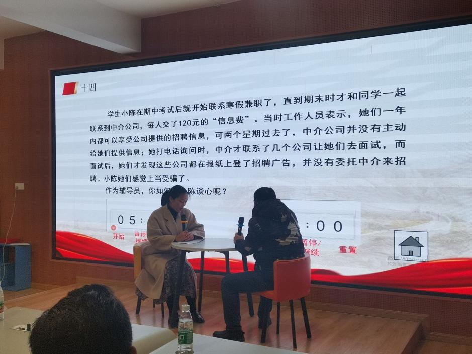 谈心谈话主要考察辅导员对学生特征、学生成长成才规律的了解把握程度,对学生的教育引导、帮助学生解决困惑等方面的能力。比赛以情景再现的方式,重现辅导员与学生围绕就业指导、学习生活、人际交往等热点话题面对面谈话的情景。在沟通过程中,参赛选手把脉问诊、循循善诱,结合工作实际,耐心倾听、用心交流,准确把握谈话核心,积极开展教育引导,充分展现了我校辅导员作为青年大学生知心人、热心人、引路人的专业素养和育人温度。
