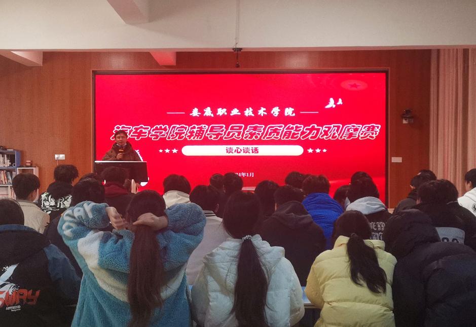 为深入学习贯彻习近平新时代中国特色社会主义思想,进一步加强新时代辅导员队伍建设,不断提升辅导员理论水平、职业能力和专业素养,推动辅导员队伍专业化、职业化建设,2024年1月4日下午,汽车学院辅导员素质能力(谈心谈话)大赛成功举办。大赛邀请了学校学工处处长李规、汽车学院党支部书记苏志华、汽车学院副院长陈宝华、学工干事吴恕担任评委。汽车学院副院长李李铁侠主持大赛,各学生代表现场观摩比赛。
