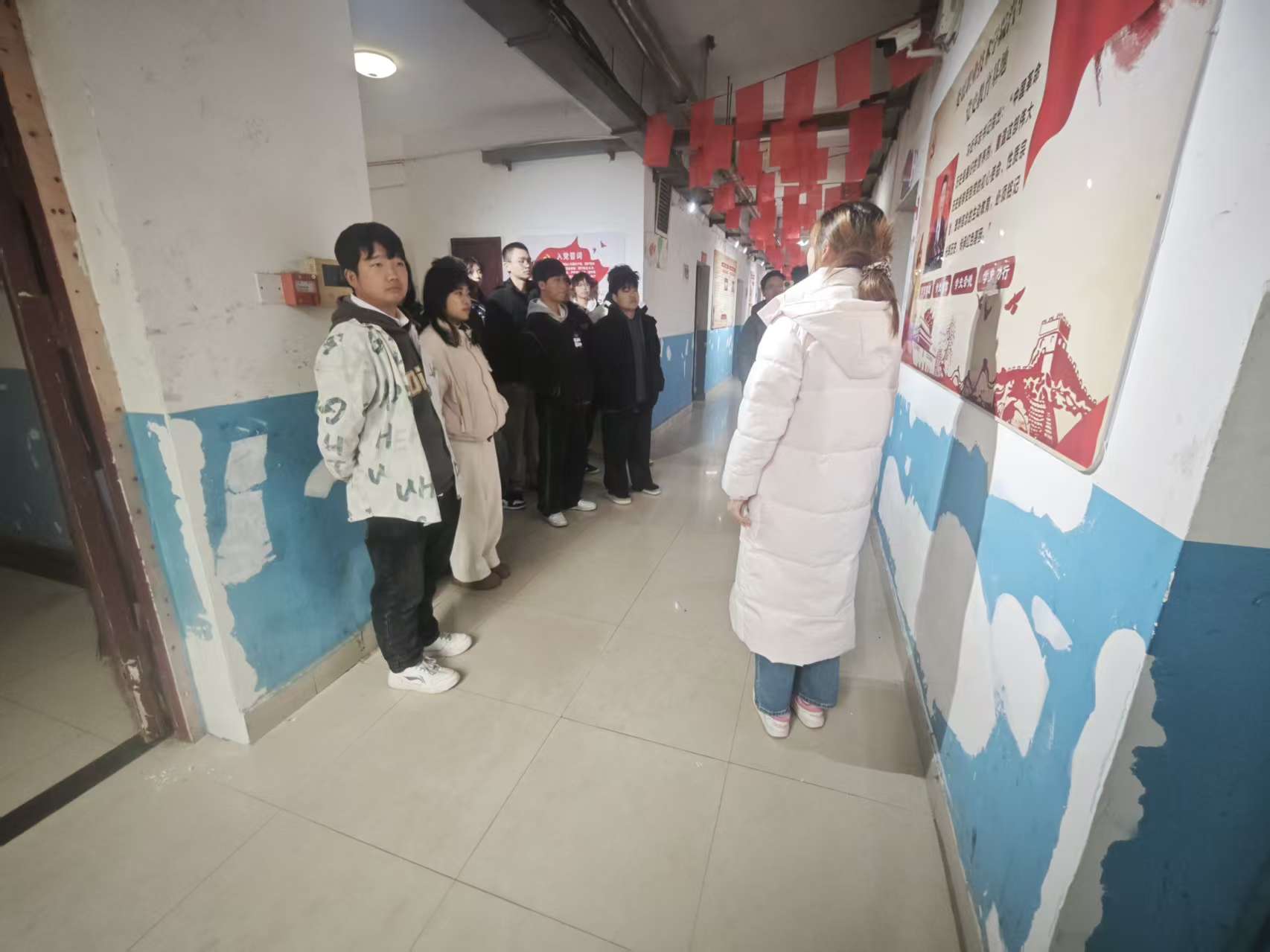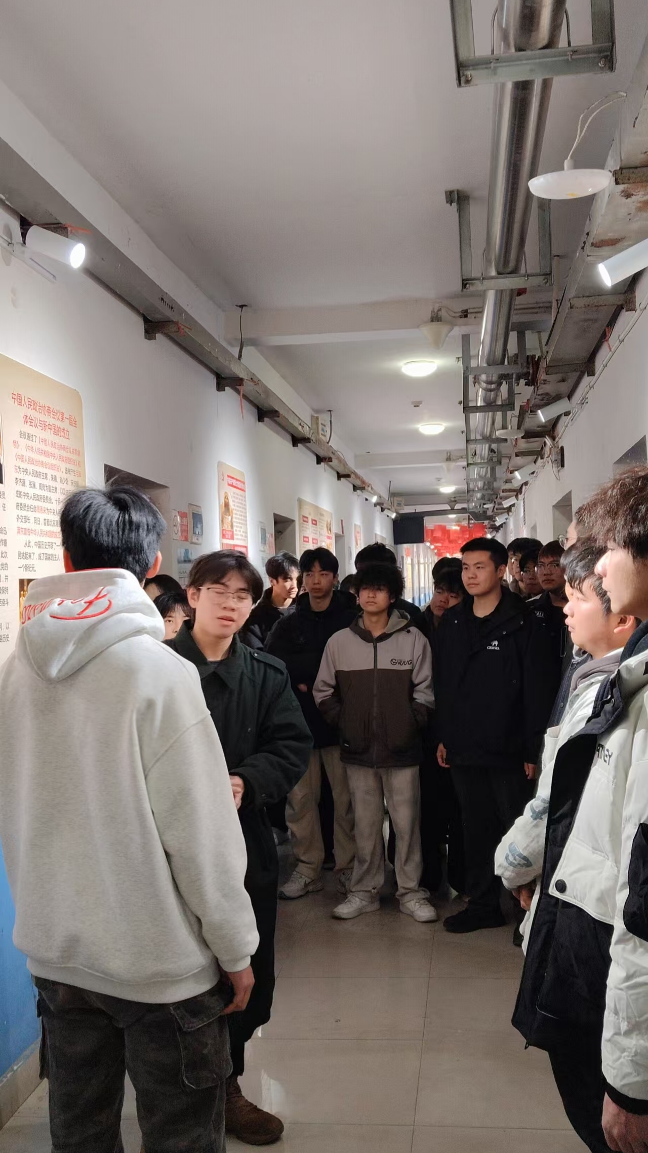 在党史基地的红色长廊里,鲜艳的红色装饰错落悬挂,一幅幅党史展板生动清晰地展现着党的百年发展历程与辉煌成就。从现场照片中清晰可见,入党积极分子们以班级为单位整齐列队,有的凝神静气认真聆听讲解人员的细致介绍,有的俯身驻足凝视展板上的党史文字与珍贵影像,神情格外专注。大家沿着红色长廊缓步前行,在一段段波澜壮阔的文字记述、一幅幅承载记忆的历史图片中,沉浸式重温党的峥嵘岁月,深刻感悟革命先辈矢志不渝的初心使命,途中还不时围在一起相互交流学习体会、分享感悟心得,在思想的碰撞与交流中进一步深化对党史的理解与认知。