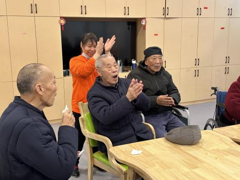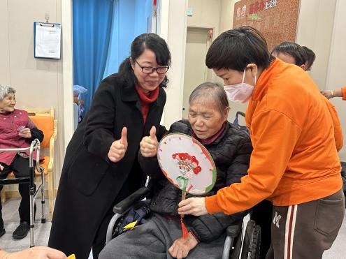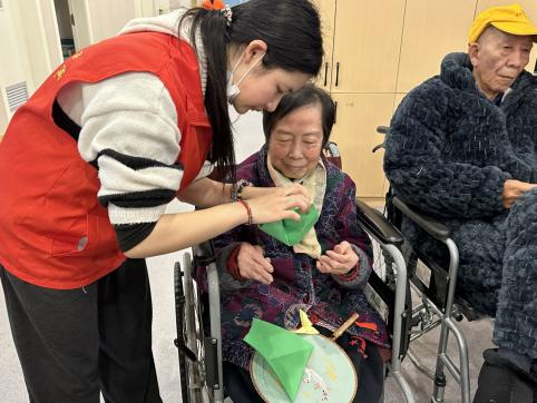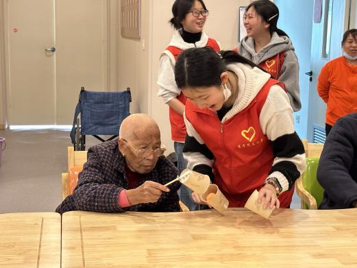 在手工活动中,志愿者们耐心地向老人们演示折叠方法与注意事项,老人们也积极参与其中,他们起初手法有些生疏,志愿者们在身旁逐步悉心指导,逐渐熟练起来。这些手工活动锻炼了老人的手指灵活性和专注力,让他们在过程中感受到快乐和成就感,最后志愿者还为老人们送上商学院女红协会精心制作的手工团扇留作纪念,这些温暖的举动,让老人们切实感受到了社会的关爱与温暖,让整个养老院充满了浓浓的温情。