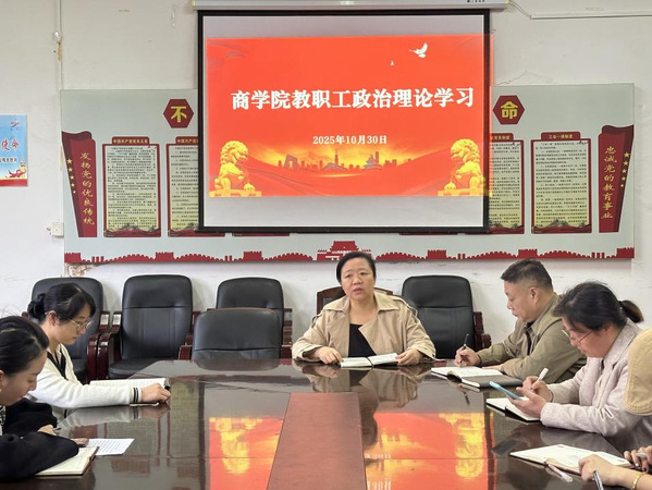 2025年10月30日,在实训楼207室,商学院开展了全体教职工政治理论学习,本次学习由商学院党总支书记禹云主持。
