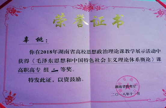 12月2日,全省高校思想政治理论课教学展示竞赛决赛在湖南科技大学落下帷幕,我院思政课部辜桃老师喜获高职高专组《毛泽东思想和中国特色社会主义理论体系概论》二等奖。
