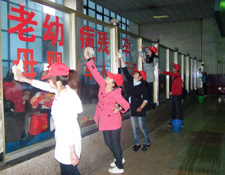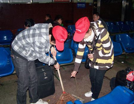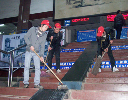 公共事务管理系的青年志愿者们分别将火车站的售票厅、进站口、大厅楼梯、候车厅、母婴休息室、以及各个走廊进行了清扫和拖抹,与此同时,志愿者还帮助行李过重的旅客搬运行李,不管是打扫卫生还是为行人提衣纳物的,在朱主任和施老师的协助和亲自带领下整个清扫活动进行得井井有条。