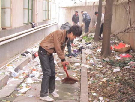 志愿者清扫1栋宿舍楼的死角