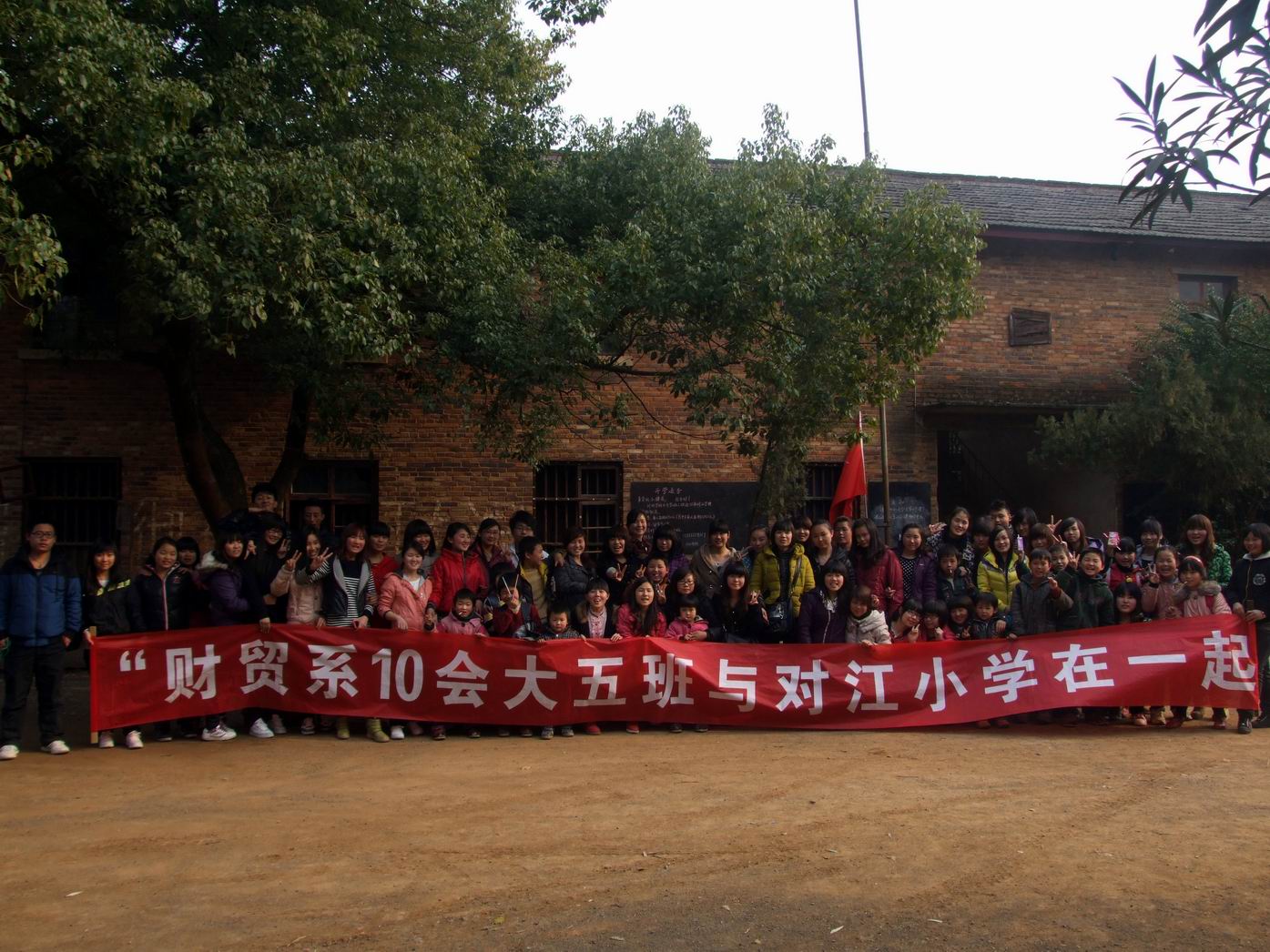 在对江学校,仅有的50余名学生中,有很多留守儿童和孤儿。为响应学院“三月学雷锋”的号召,着力改善教学环境,促进孩子们的健康成长,形成一对一的援助机制,财贸系10会大五班志愿者在班委会的自发组织和辅导员谭雪晴老师的带领下,打着“财贸系10会大五班与对江学校在一起”的横幅,来到对江学校为孩子们献上自己的爱心。