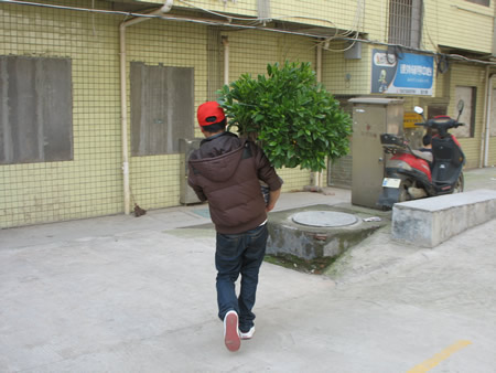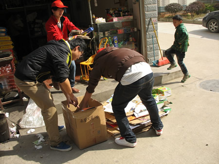9点半,待兑换植物被载到现场,队员们布置好植物展台,活动正式开始。老早就被吸引过来的居民纷纷了解着兑换植物的习性、价格,然后忙不迭的转身回家清理家里可拿来兑换的废品。第一位参与兑换的是一个小杂货店的老板娘,手里抱着一个小孩,队员们主动提出上门服务,跟着老板娘回去把废纸盒整理起来,过称,然后计算出相应可兑换的植物。随着第一个兑换过程的结束,队员们因担心无人捧场而悬着的心终于放下了。