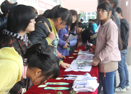 此次评审的方式分为大众评审和专家评审,参赛作品在主教学楼门前进行展览。本次比赛参展的作品形式多样取材广泛,其中包括插花、剪纸、折纸、十字绣以及环保意义十足的手工编织袋,展览现场吸引力不少同学的驻足观看。其中,剪纸《庆祝中国共产党成立九十一周年》让现场同学啧啧称赞。