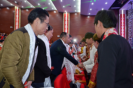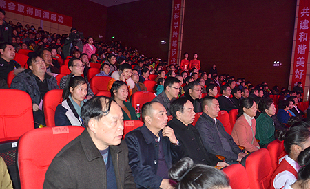 为让广大师生更多地了解各民族的文化艺术,增进同学们对各民族文化的认同,营造团结、和谐的多元校园文化艺术氛围,促进各民族文化的交流,12月30日晚,我院在新培训楼报告厅隆重举办“娄职一家亲”民族文化交流歌舞晚会。娄底市委正厅级干部肖新桃,娄底市人大常委会副主任刘宏业,娄底市委宣传部第一副部长何一波,娄底市委组织部副部长、市老干局局长袁若宁,娄底市直机关工委书记刘福高,娄底市民宗局局长曾志君,娄底市教育局副局长张怡南、高静,以及我院全体院领导、各系部处室负责人出席,全院300名汉族学生代表、400名少数民族学生代表参加并观看了晚会。