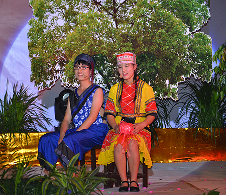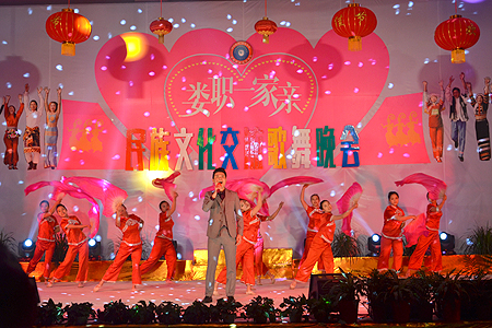 晚会在歌舞《欢聚一堂》中拉开帷幕。整场晚会以民族文化介绍和民族文化艺术表演两大版块穿插进行。藏族、侗族、傣族、苗族等少数民族学生轮番上场,不仅为大家介绍了本民族的文化特色和风土人情,更将本民族具有代表性的歌舞及表演活动穿插其中,舞台效果绚烂夺目,现场气氛欢乐而热烈。我院藏族学生从万里之遥的拉萨带来的藏族四宝?D?D糌粑、牛羊肉、酥油茶、青稞酒引起了现场观众的极大兴趣,随后表演的藏族祝酒歌、藏族弦子都带着浓浓的藏族风情,博得了观众们热烈的掌声。藏族学生还给现场嘉宾献上了洁白的哈达。还有侗族的大歌、情歌对唱,傣族优美柔和、灵巧活波的舞蹈,苗族窄袖、大领、对襟短衣及色泽艳丽的百褶裙,无一不让观众们惊叹欢呼。最后,晚会在全体演员《爱我中华》的歌声中落下帷幕。