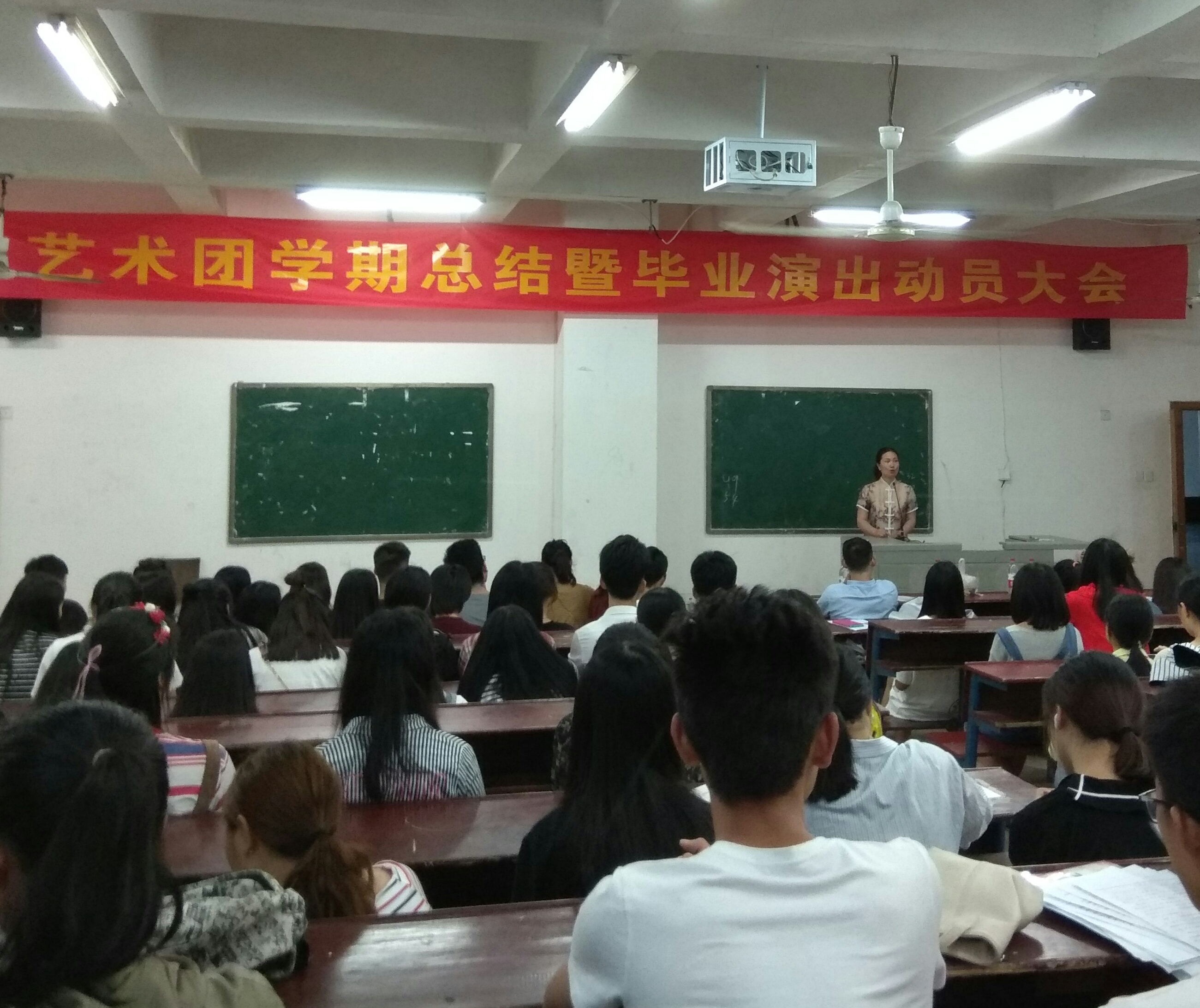 6月1日晚上7:00,我校团委在主教学楼举行了“艺术团学期工作总结暨毕业演出动员大会”。出席本次会议的领导和老师分别是学工处处长李规、院团委书记刘媛、艺术团团长刘轶中和院团委杨翰儒老师,此外,艺术团合唱队、司仪主持队、礼仪队和舞蹈队全体同学参加了本次会议,会议由刘媛书记主持。