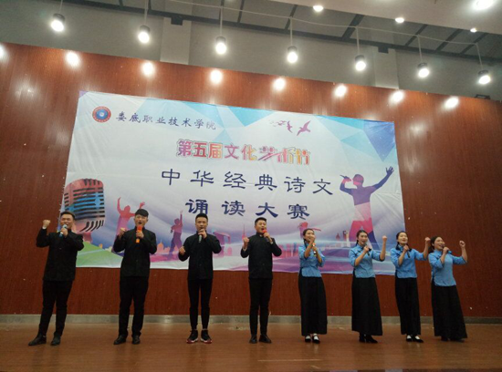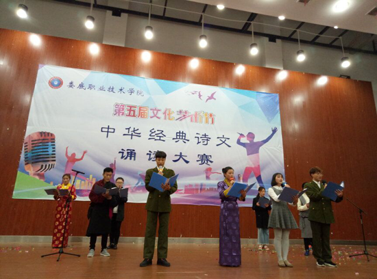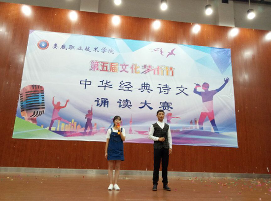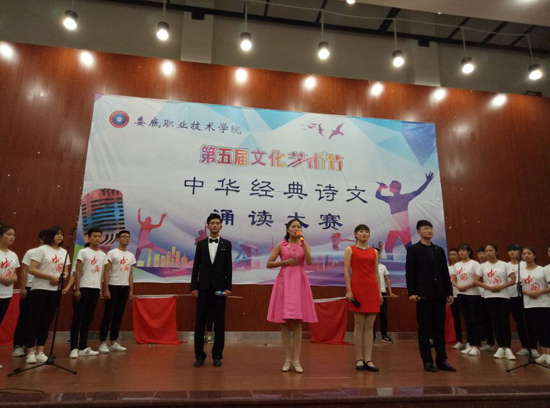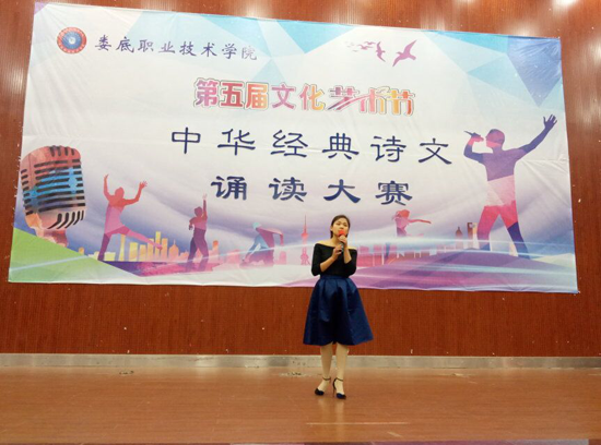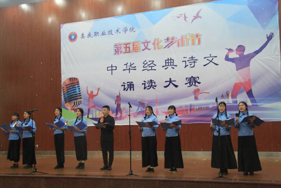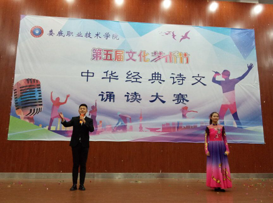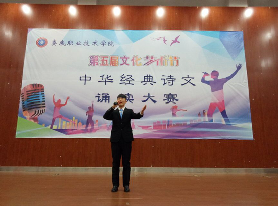 11月22日晚,第五届文化艺术节之中华经典诗文诵读大赛在娄底职业技术学院新培楼报告厅举行,大赛由校团委、教务处主办,公共课部教授徐续红、校团委书记刘媛、艺术团团长刘轶中、宣传部副部长张波、教务处副处长朱燕担任大赛评委。