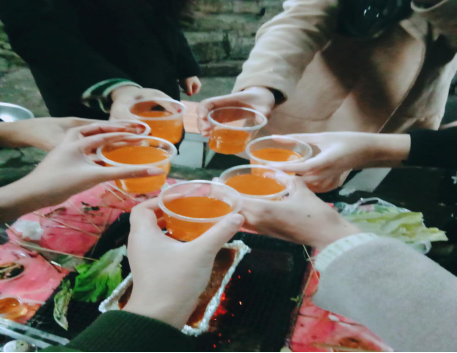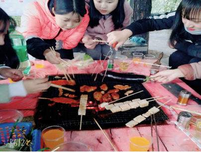 在班长,副班长,团支书的带领下,烧烤活动在欢乐的气氛中有序进行。同学们各司其职,有的在工作员阿姨的指导下生起了火,有的准备食材……大家的热情也随着炭火一般,逐渐升来越旺,一时之间只听闻嘴巴吧滋吧滋作响的声音。偶尔穿插几个喝喝喝喝的字眼,你敬我我敬你的声音,欢声、笑声不断,其乐融融,和谐愉快,大家尽情的享受着烧烤的乐趣。