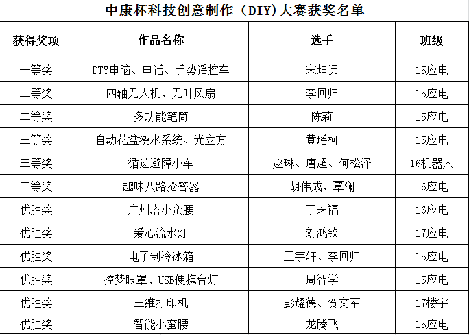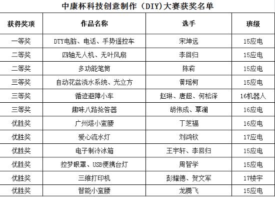 比赛结束后,荣获本次大赛一等奖的是电信学院15级应用电子技术班宋坤远的《DTY电脑、电话、手势遥控车》作品;二等奖的是电信学院15级应用电子技术班李回归的《四轴无人机、无叶风扇》作品、电信学院15级应用电子技术班陈莉的《多功能笔筒》作品;三等奖的是电信学院15级应用电子技术班黄瑶柯的《自动花盆浇水系统、光立方》作品、电信学院16级工业机器人班赵琳、唐超、何松泽的《循迹避障小车》作品、电信学院16级应用电子技术班胡伟成、覃澜的《趣味八路抢答器》作品;优胜奖的是电信学院16级应用电子技术班丁芝福的《广州塔小蛮腰》作品、电信学院17级建筑智能化工程技术(简称楼宇班)班彭耀德、贺文军的《三维打印机》等六位同学的作品。
