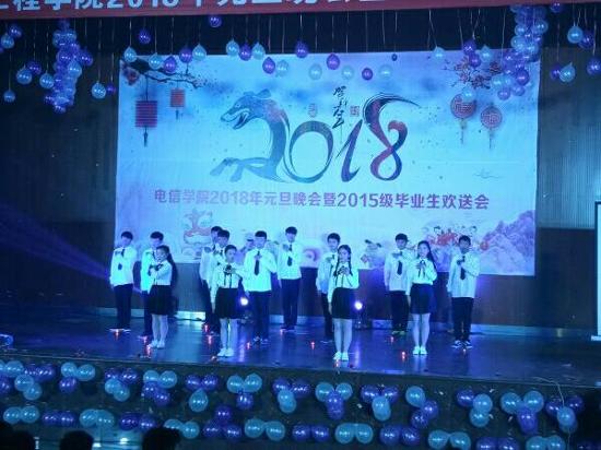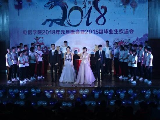12月27日晚,电子信息工程学院2018元旦晚会暨2015级毕业晚会在新培楼学术报告厅圆满落幕。学校党委副书记王健龙,学工处处长李规,团委书记刘媛,电信学院院长刘罗仁,副院长谢完成、晏然,学院全体师生以及来自各二级学院的师生代表欢聚一堂,在暖冬之夜,欣赏这场青春盛宴。