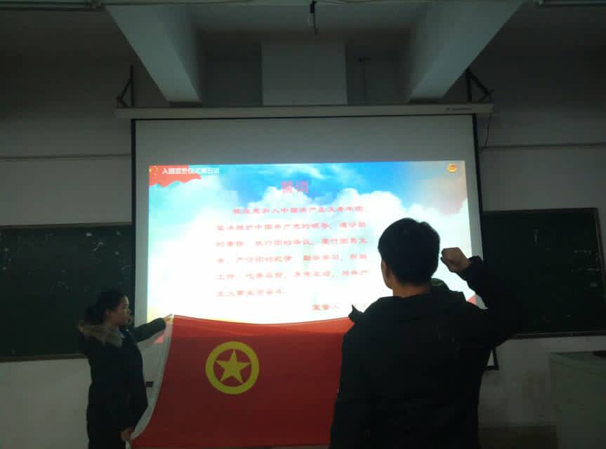 会议第一项,全体人员起立奏唱国歌和共青团歌,高昂的歌声使人精神抖擞,展现了团员们蓬勃的热情。会议第二项校团委组织部肖云(210教室)/漆美林(110教室)同学宣读团章。《团章》规定:“年龄在十四周岁以上,二十八周岁以下的中国青年,承认团的章程,愿意参加团的一个组织并在其中积极工作,执行团的决议和按期交纳团费的,可以申请加入中国共产主义青年团。”新团员必须在代表着团组织的团旗下,举行一次严肃、庄严而富有教育意义的入团宣誓仪式。不要把这次的宣誓仪式只看作一种形式,新团员应该通过这个仪式将自己的入团誓词牢记在心,并以此激励自己作为一名共青团员的荣誉感和责任感。