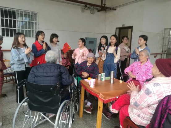 随后我们又跟随着工作人员分别来到了三层楼的老年公寓,在详细了解了老人们的情况后,我们把所有带来的水果分为了30份,保证每个老人都不落下。志愿者们的积极性是我没有想到的,在确保所有的水果都分发到位以后,一场别出声面的“演出”开始了。起初,我们只是想给那些在外面休息的老人们表演一些节目,并不想打扰那些休息的老人,但随着活动的展开,越来越多的老人加入到我们的行列,顿时间位于一楼的休息亭坐满了人,不时还传来阵阵掌声。志愿者们也是越演越高兴,原本没有的节目也被现加了进来,场面顿时沸腾了,这让我们活动的组织者和福利院的工作人员都露出了欣慰的笑容,12:00演出结束。累了一上午的老人们也要休息一下了,志愿者们将老人送回各自房间,随后组织返校。
