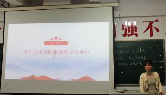 杨倩赟老师就《十九大报告学习解读》为主题,重点讲述了“十九大报告的重要意义及地位”、“十九大报告全文学习解读”和“新时代,新使命,新思想,新征程”三部分,引导学生干部把思想和行动统一到党的十九大精神上来。