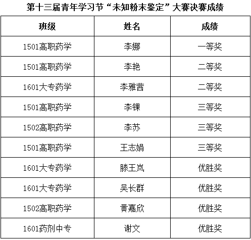 为积极营造“比技能,展风采”的良好校园文化氛围,将理论知识与实际操作有效结合,实现“教、学、考、做”合一,提高学生自身实践动手能力,娄底职业技术学院医药技术学院于2018年4月18日——5月9日举办了第十三届青年学习节之“未知粉末鉴定大赛”,参赛选手来自高职药学1501、高职药学1502、药剂中专1601、药学大专1601各班的学生代表。