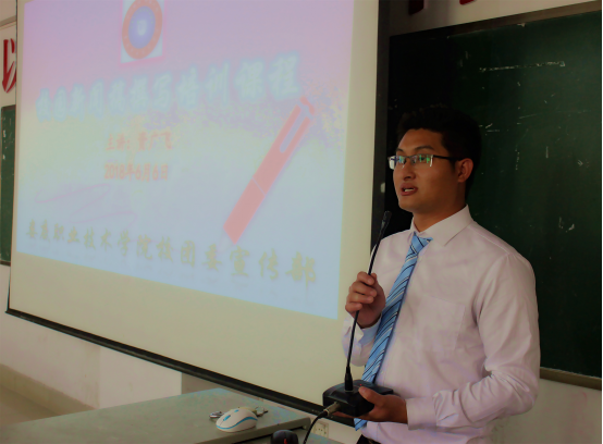 为充分发挥我校各级宣传部的工作积极性,提高理论素养和新闻写作能力,建设一批高素质的宣传报道队伍,在我校团委书记刘媛、团委副书记游骏、宣传统战部等老师的悉心指导下,校团委宣传部于6月6日在主教楼210教室举办“如何写好校园新闻”专题知识培训。参与本次培训的人员有校记者站、校学生会宣传部、各二级学院宣传部、校团委网络部、学社联宣传部以及各协会宣传部等。本次培训课程由校团委宣传部部长资广飞主讲。